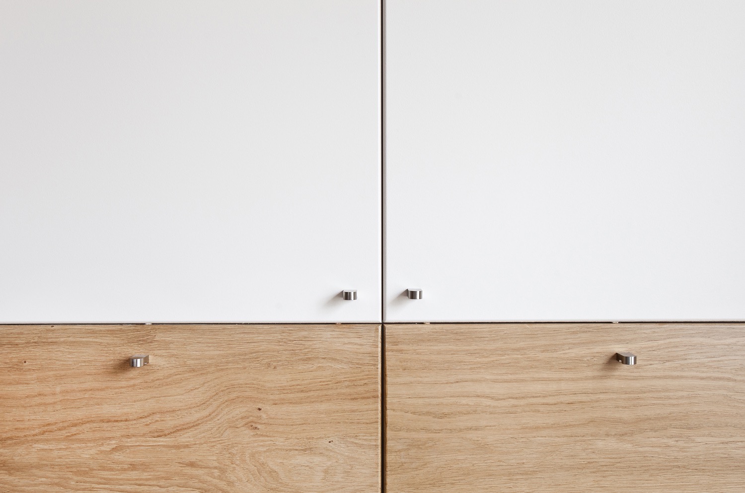 La chambre est réalisée avec un grand dressing sur mesure. Ce meuble est conçu sur la même base que les différentes menuiseries présentes dans la rénovation. Un ensemble de tiroirs en chêne parcourt l’ensemble de ce dressing sur mesure. Nous avons conservé une niche afin d’y inclure la télévision en son centre. Enfin, les boutons de porte choisis par les clients proviennent de chez IKEA.