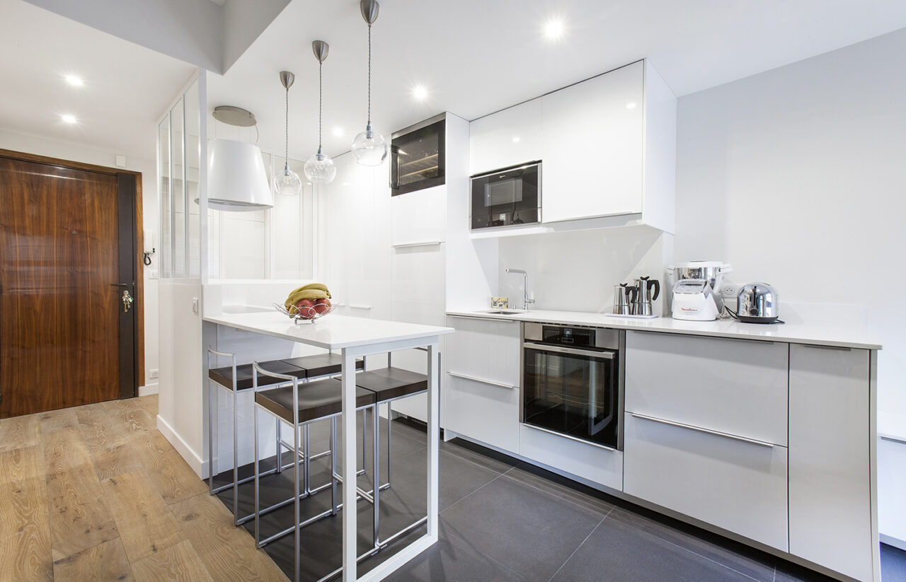 L’entrée de l’appartement se fait sur un dressing sur mesure que nos menuisiers se sont chargés de construire. Ce dressing sur mesure se compose d’une penderie ainsi qu’une partie rangement pour chaussures. La cuisine ouverte sur le salon scandinave est séparée de l’entrée avec son dressing sur mesure par une verrière également sur mesure. Nous avons intégré cette verrière sur mesure afin de délimiter la cuisine de l’entrée tout en conservant une lumière naturelle.