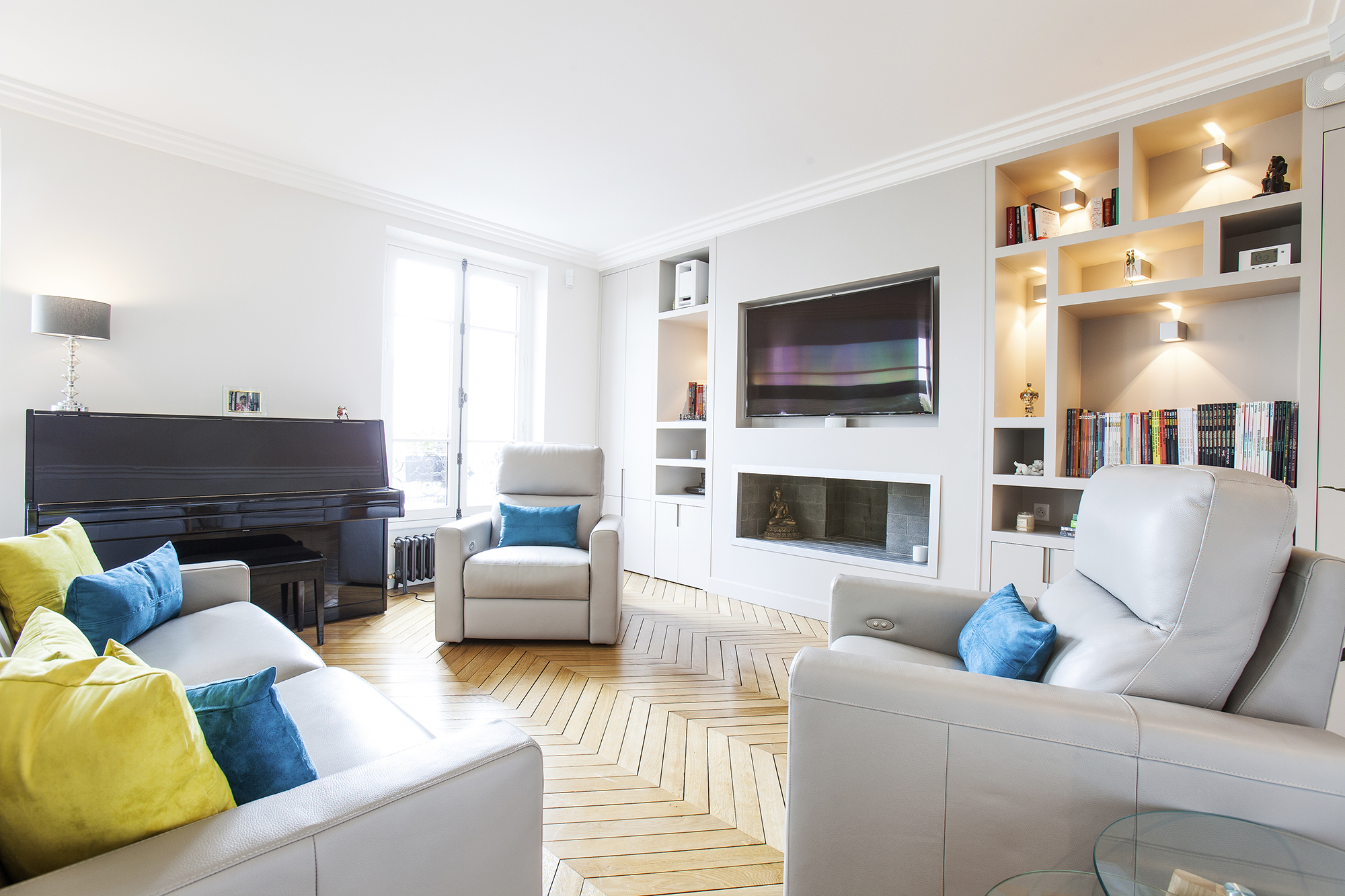 Nous voici maintenant dans un grand espace de réception lumineux. Dans cette pièce, nous avons procédé à la pose de staff réalisé sur mesure par notre fournisseur Sedap. Nos menuisiers ont travaillé sur une large bibliothèque sur mesure. Celle-ci intègre un espace pour la télévision ainsi que l’ancienne cheminée que nous avons remis en état de fonctionnement. Nous avons intégré des rangements toutes hauteurs à cette bibliothèque sur mesure, ainsi que des rangements en partie basse. Les portes de ces rangements sont conçues avec poignée intégrée, que l’on retrouvera sur les différentes menuiseries sur mesure de l’appartement. Des niches asymétriques habillent le reste de la bibliothèque sur mesure et exposent les livres et objets décoratifs de la cliente. Enfin, dans cette pièce nous trouvons un large dressing sur mesure. Réalisé en médium peint, ce dressing sur mesure dispose des mêmes détails que la bibliothèque, offrant à ses menuiseries une certaine harmonie.