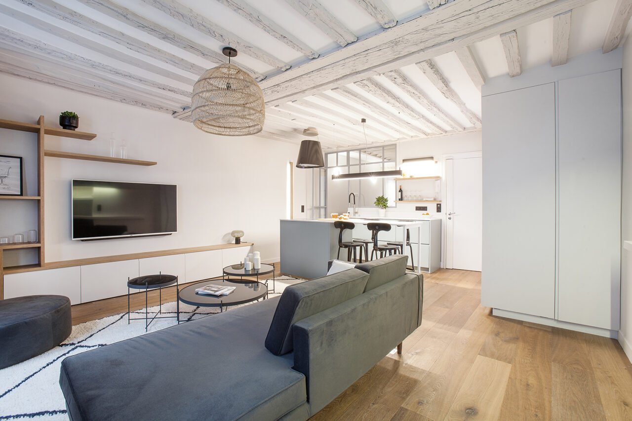 Tout en faisant de cette rénovation un espace chaleureux et cosy les propriétaires souhaitaient découvrir le mur de pierre et conserver les poutres pour garder le côté authentique et ne pas dénaturer l’appartement. Pour cela ils ont fait appel à notre entreprise générale, Ouest Home qui s’est chargé de la rénovation ainsi que la décoration intérieure de l’appartement.