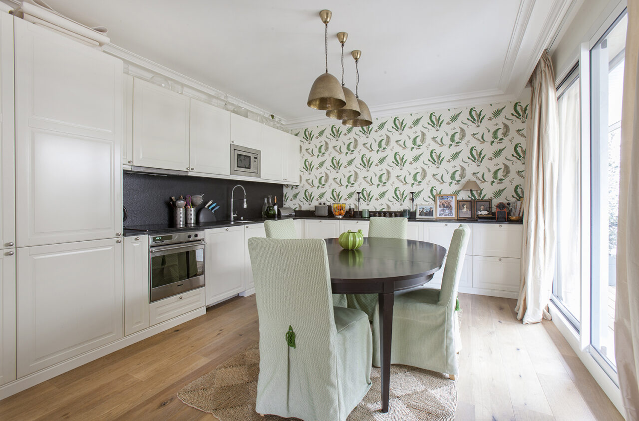 Toujours dans le but d’habiller cette cuisine indépendante, notre cliente souhaitait un papier peint floral, nous avons donc procédé au collage de celui qu’elle avait sélectionné.