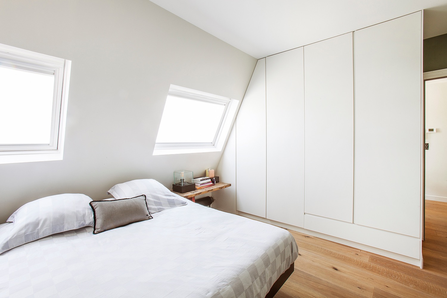 Nos ouvriers ont amené une lumière naturelle à cette chambre sur mesure grâce à une verrière sur mesure qui donne sur la terrasse de l’appartement. Ils ont aussi créé une tête de lit avec placard sur mesure intégré. Le meuble à chaussure de la propriétaire est également fabriqué par notre entreprise générale, afin de l’intégrer parfaitement dans une niche murale déjà présente dans la chambre sur mesure.