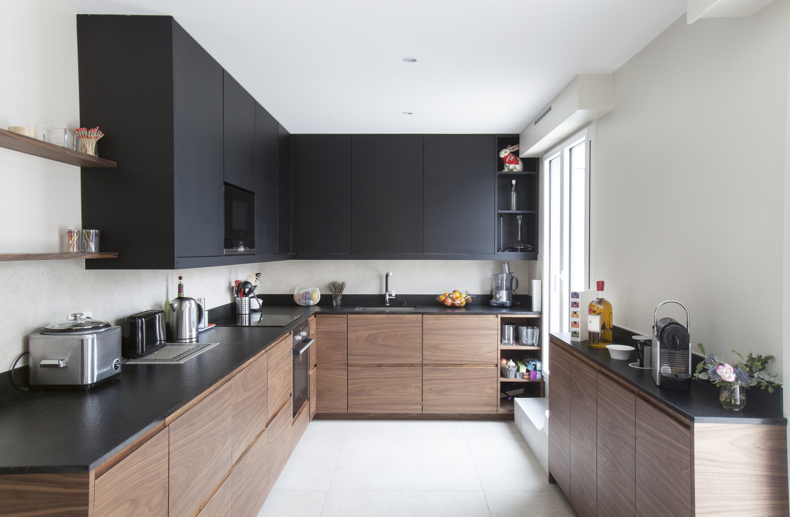 À la demande des propriétaires, notre architecte a dessiné une cuisine élégante et de caractère, en placage de noyer véritable vernis pour les meubles bas et laqué noire mat pour les meubles hauts ainsi que la colonne. L’ensemble de la cuisine a été conçu grâce à des caissons IKEA et les portes sur mesure nous ont été fournies par BS STYLE.
