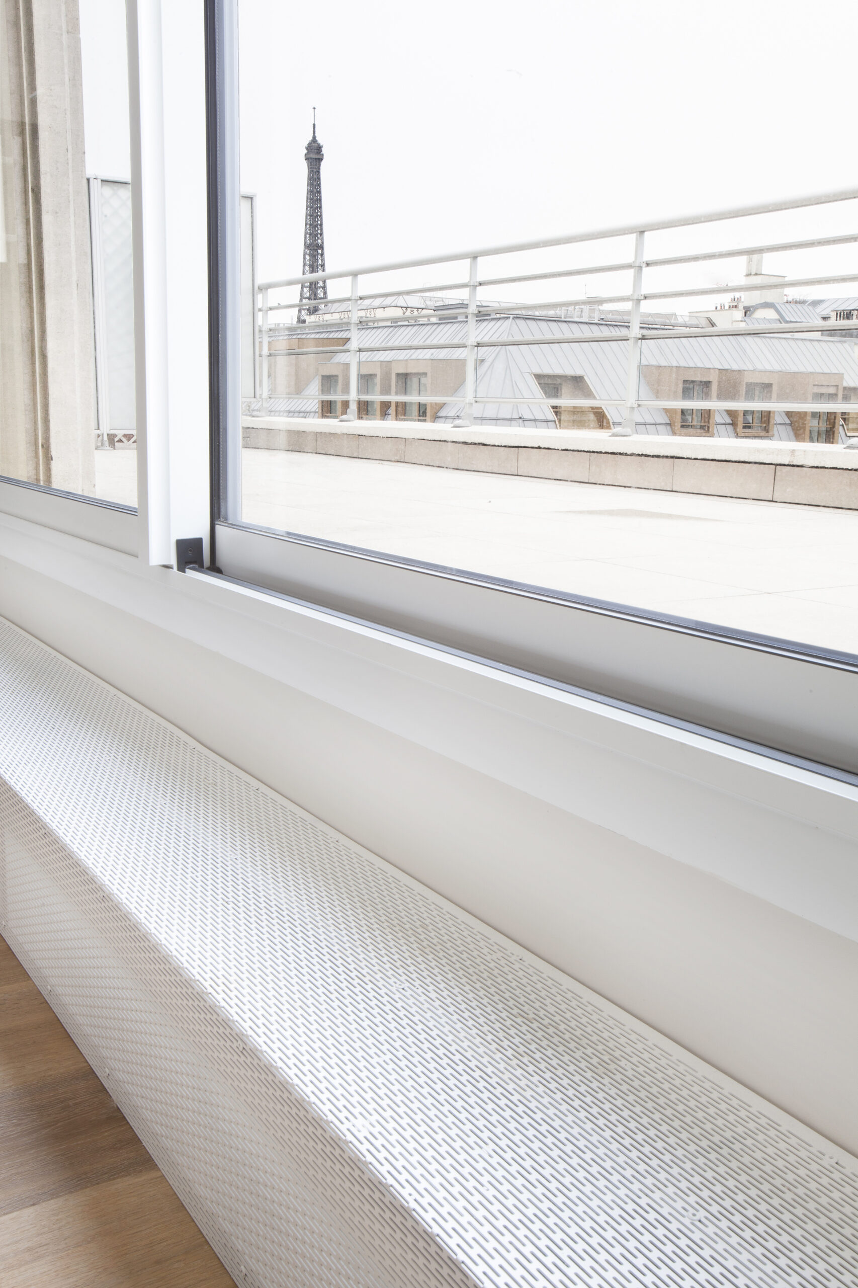De grandes baies vitrées apportent une lumière naturelle traversante dans l’espace salon salle à manger. Ici, nous avons voulu une très grande pièce de réception, largement ouverte sur les toits parisiens, pour obtenir un sentiment d’espace.