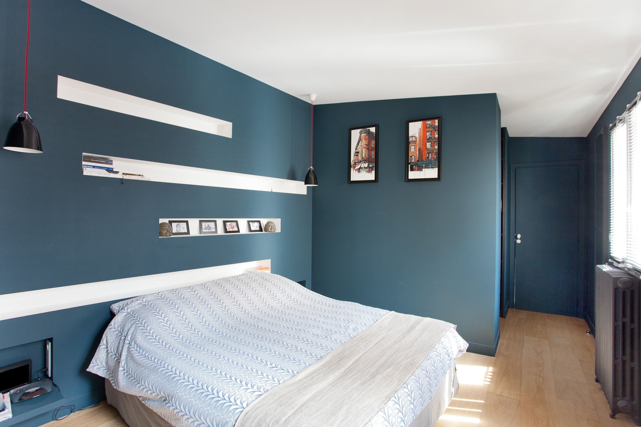 La chambre parentale bénéficie d’une tête de lit sur mesure et de petites tables de chevet sur mesure. La tête de lit sur mesure est en fait trois longues niches où l’on peut apporter diverses décorations. Les tables de chevets sont encastrées dans la tête de lit sur mesure et sont peintes de la couleur Hague Blue n°30 de chez Farrow & Ball, tout comme l’ensemble de la chambre parentale.