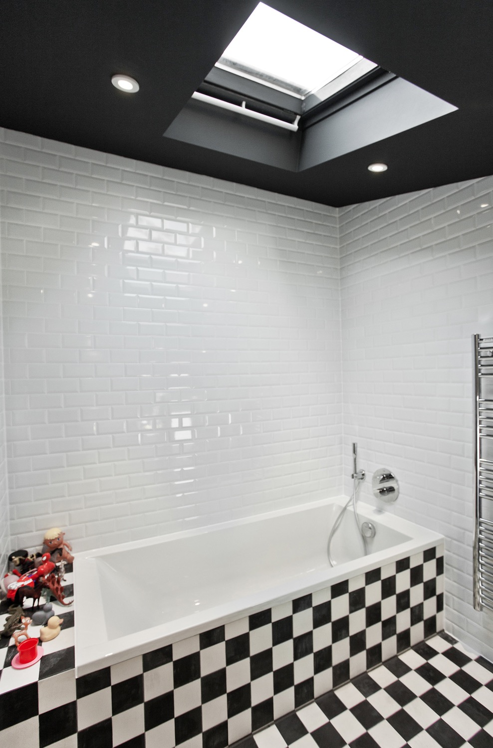La salle de bain qui accompagne ces différents espaces reprend les goûts de la famille pour le noir et blanc. En effet, on retrouve un carreau de ciment damier au sol et un carrelage métro dans cette pièce également. Ces carrelages nous ont été fournis par Arte Casa. Un rappel avec le faux plafond, puisqu’il est peint d’un noir profond et entoure la fenêtre de toit Velux.