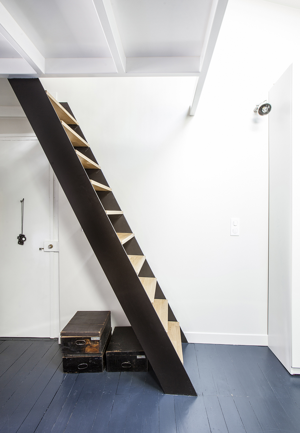 Les clients possédants ce studio et les combles qui le surplombent, il a été décidé d’ouvrir largement les combles afin d’obtenir une belle hauteur sous plafond. Une mezzanine sur mesure a été créée afin de gagner un maximum d’espace.